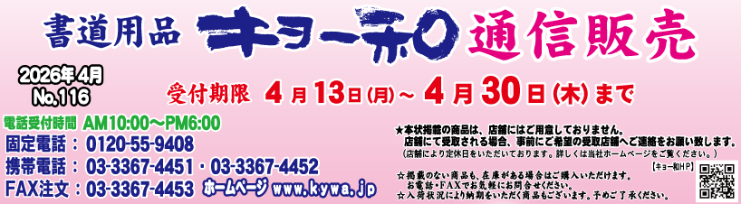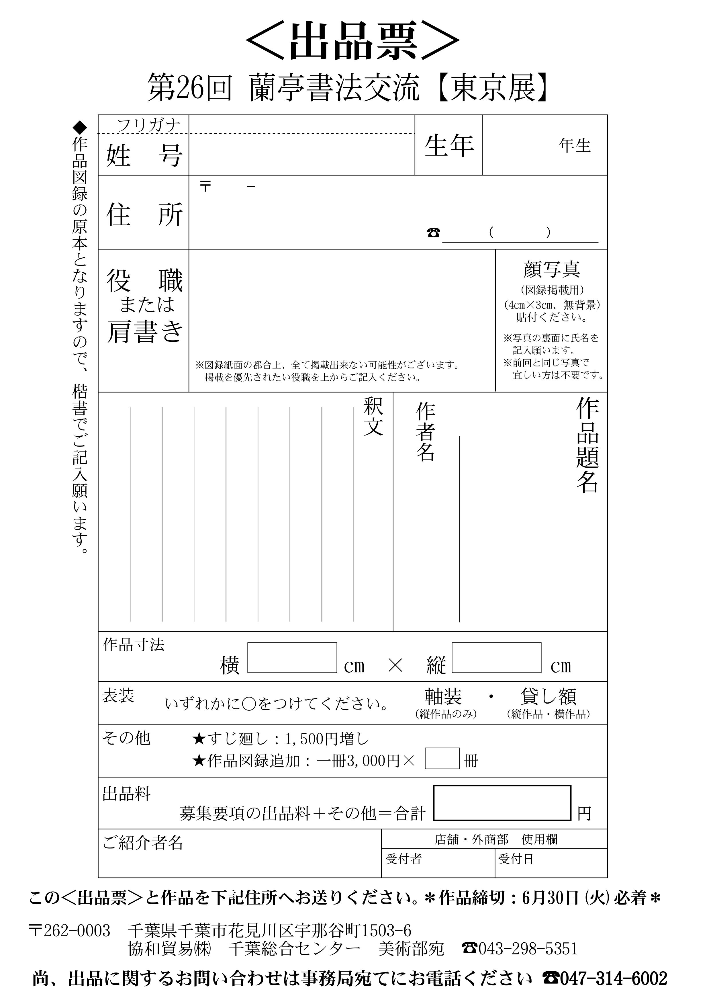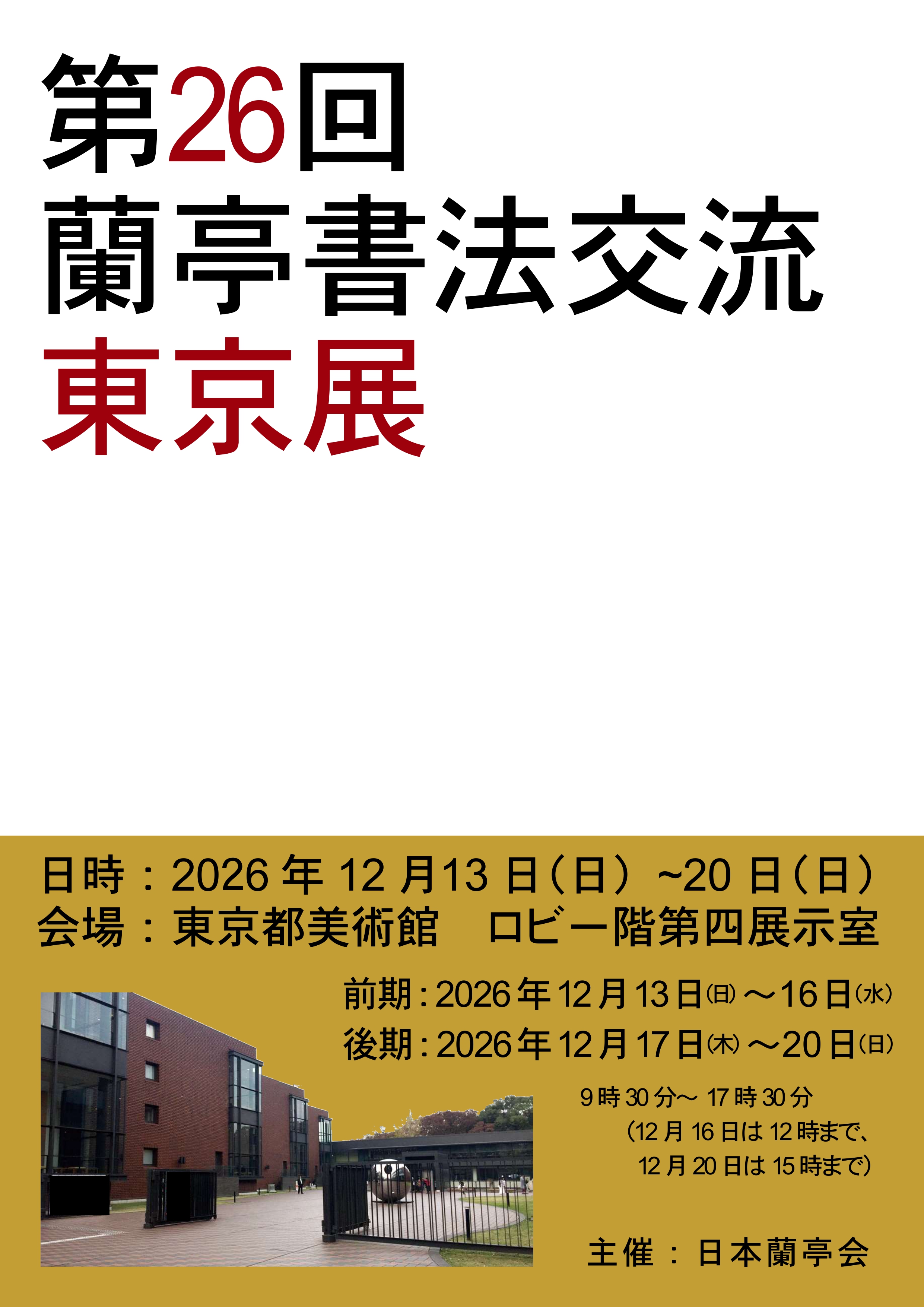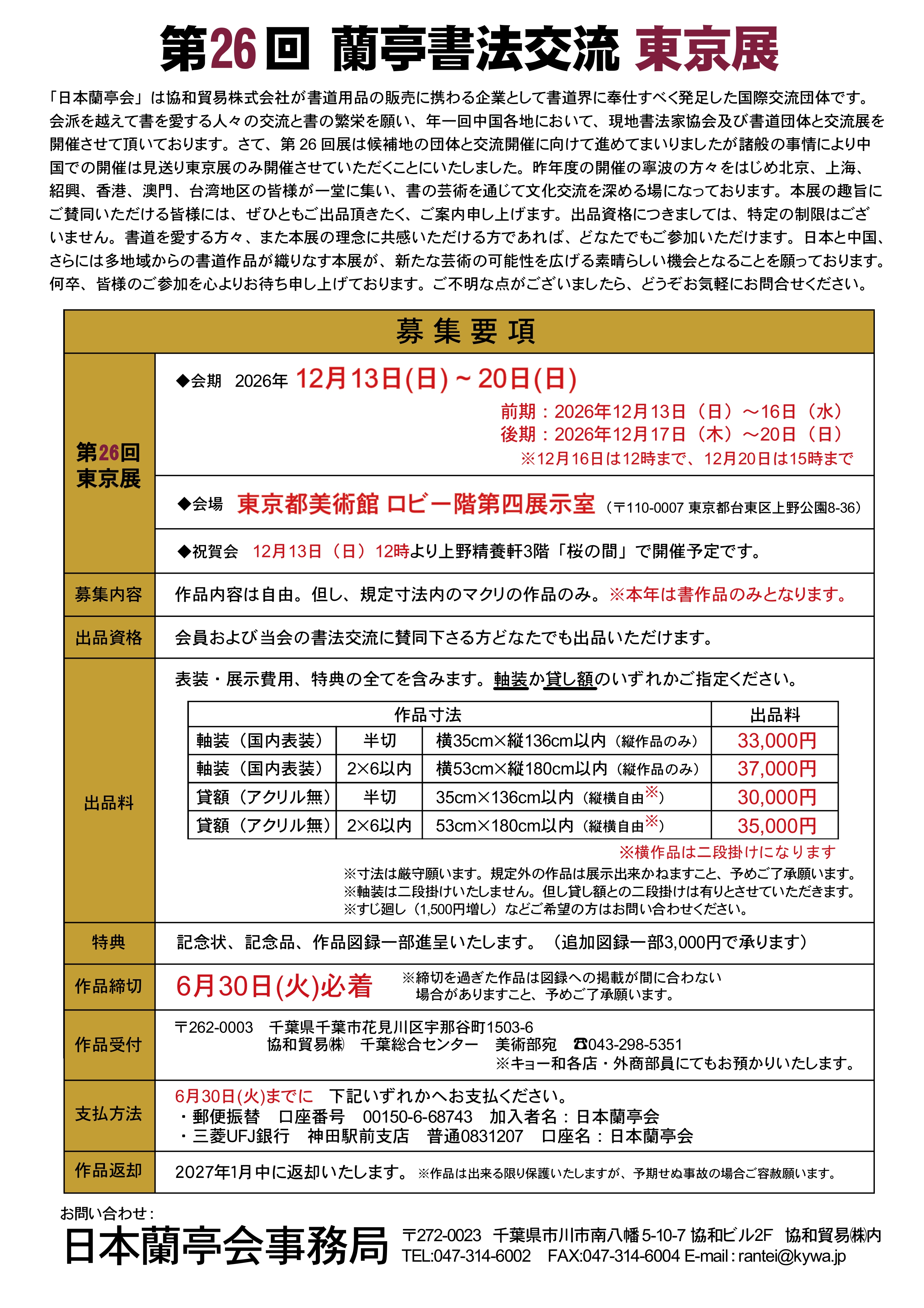 ↓DM画像をクリックすると大きい画像でご覧になれます (※ファイルデータが大きい為、データ通信量にご注意ください) ![]() ![]() ![]() ![]() ![]() ![]() ![]() ![]() ![]() ![]() ※DMやネットショップの掲載価格は総額表示となっております 詳しくは最寄りの店舗へお気軽にお問い合わせください 『第26回 蘭亭書法交流 東京展』 本年の第26回展は、候補地の団体と交流開催に向けて準備を進めてまいりましたが、 諸般の事情により中国での開催は見送り、東京展のみ開催させていただくことにいたしました。 日本をはじめ、昨年開催した寧波、北京、上海、紹興、香港、澳門、台湾地区の 皆様が一堂に集い、書の芸術を通じて文化交流を深める場になっております。 会派を問わず、書道を愛する方であればどなたでもご参加いただけます。 会員の皆様方をはじめ、本展の趣旨にご賛同いただける方々のご出品をお待ちしております。 【第26回 蘭亭書法交流 東京展】 <会期>前期:2026年12月13日(日)~16日(水) 後期:2026年12月17日(木)~20日(日) <会場>東京都美術館 ロビー階 第4展示室 作品締切:2026年6月30日(火)必着 ※締切を過ぎた作品は図録掲載が間に合わない場合がありますことを予めご了承願います。 作品受付:〒262-0003 千葉県千葉市花見川区宇那谷町1503-6 協和貿易(株) 千葉総合センター 美術部 宛 TEL:043-298-5351 ※キョー和各店、外商部員も作品を受付しております。 ↓下記の募集要項と出品票をA4サイズに印刷してご使用ください。 ![]() ![]() ![]() ※詳しいお問合せは、日本蘭亭会事務局までお願いいたします。 【お問合せ先】日本蘭亭会事務局 〒272-0023 千葉県市川市南八幡5-10-7協和ビル2F 協和貿易(株)内 日本蘭亭会事務局 宛 TEL:047-314-6002 FAX:047-314-6004 E-mail:rantei@kywa.jp