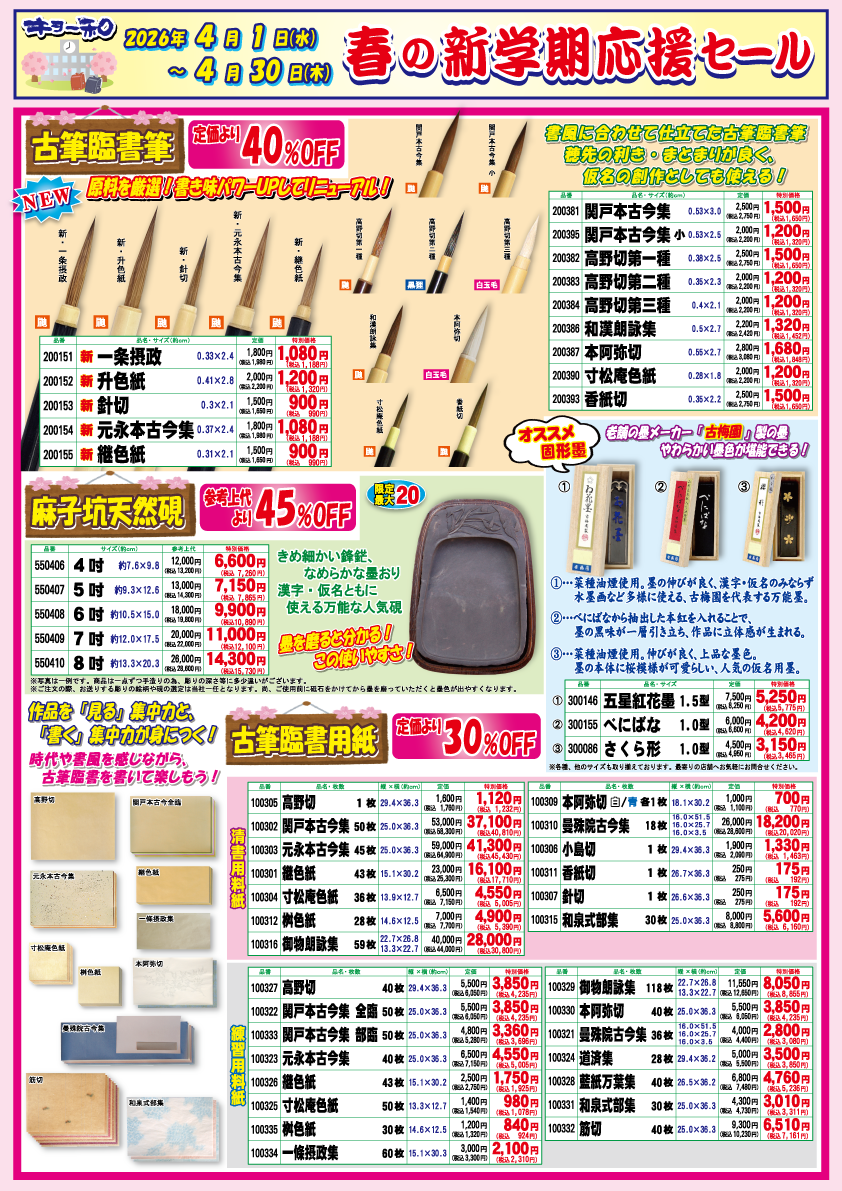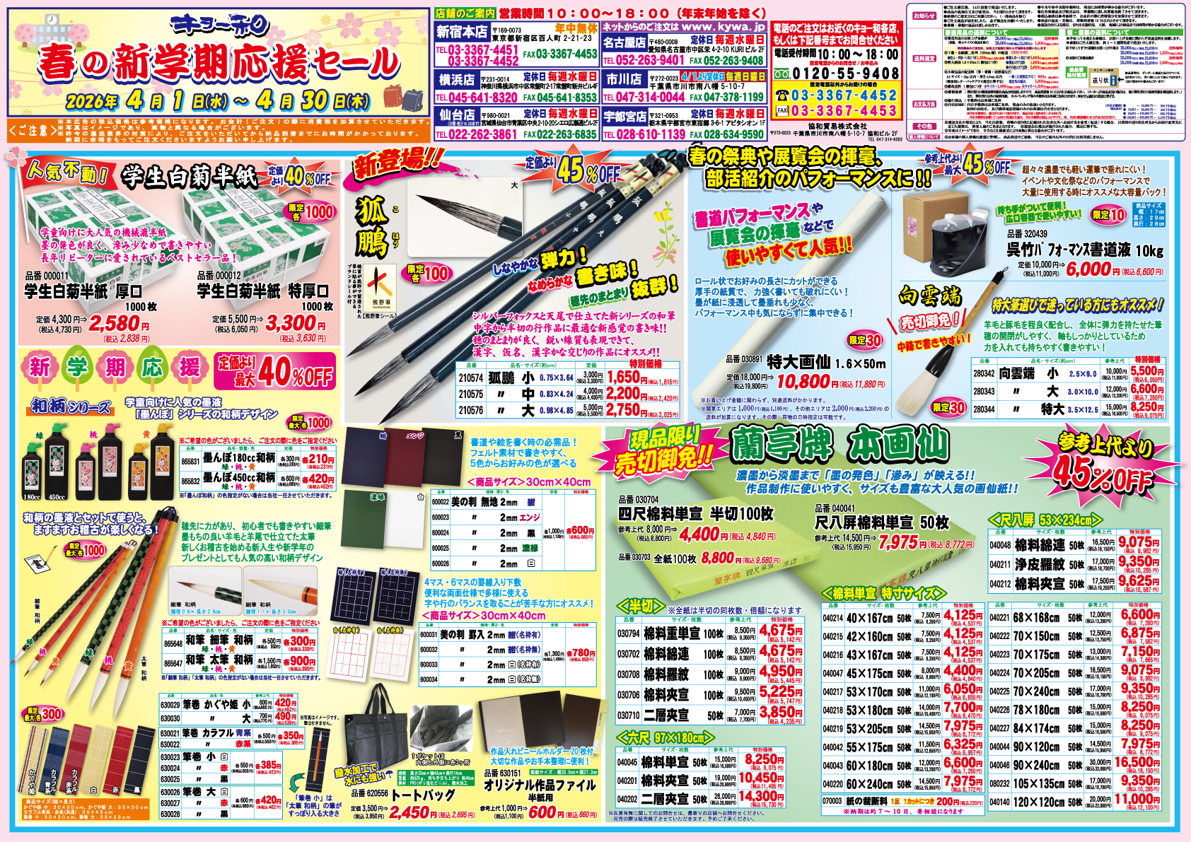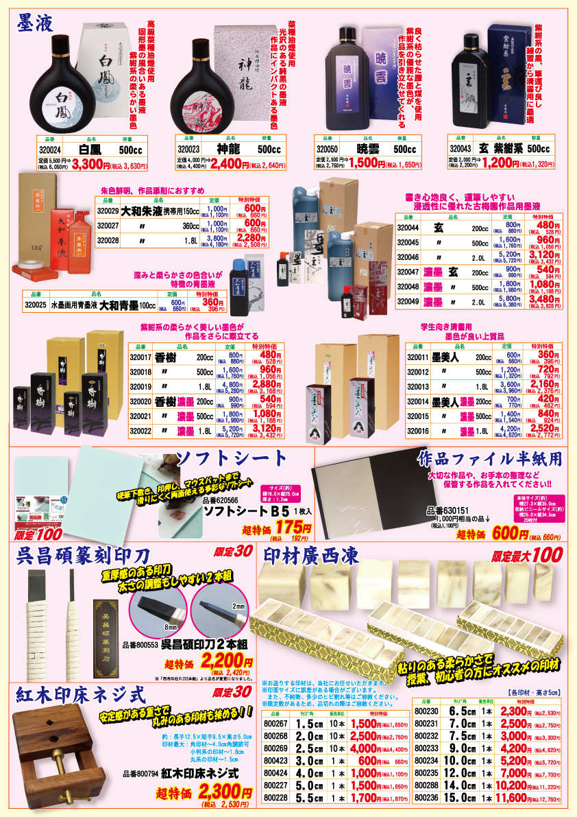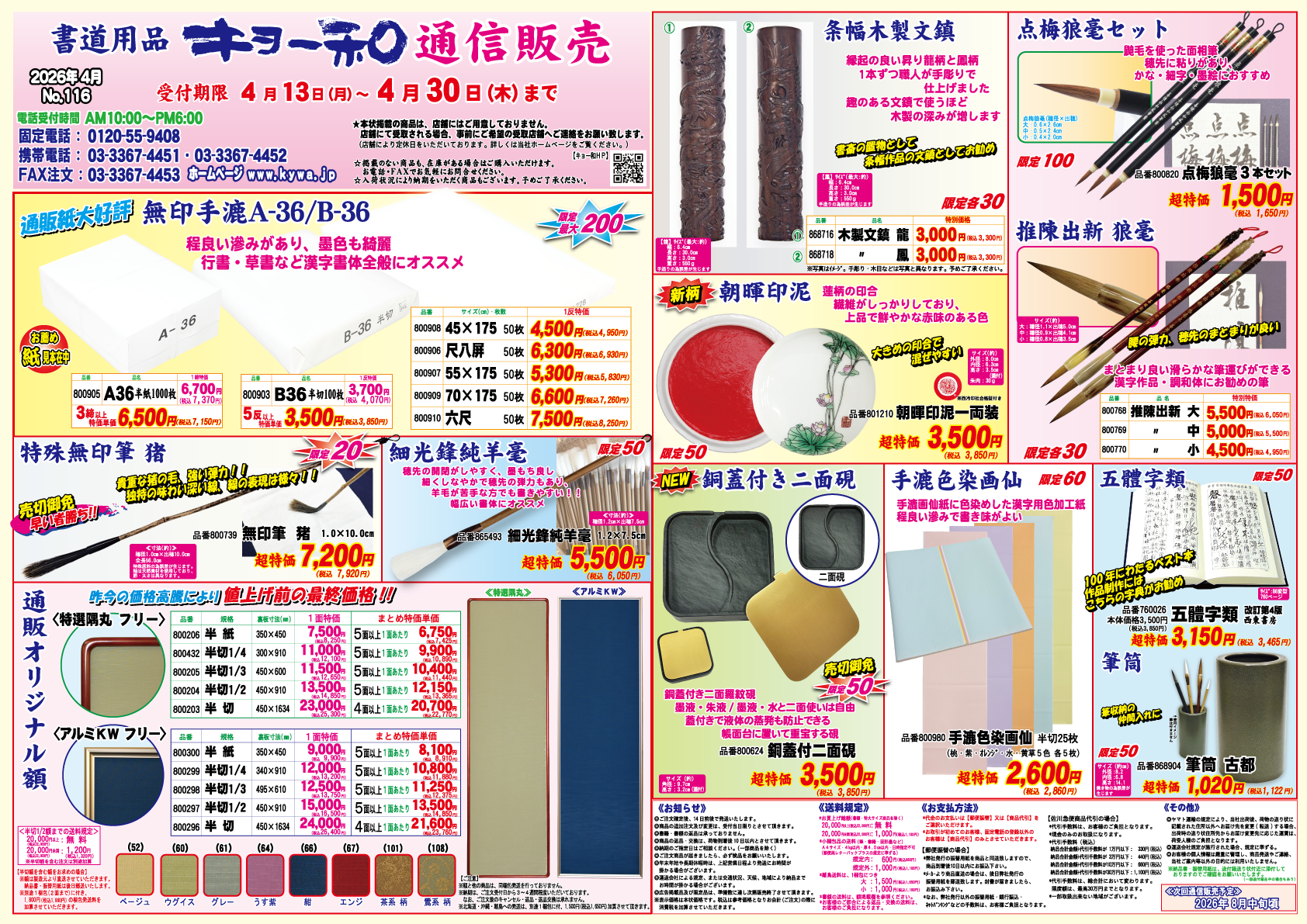 ↓DM画像をクリックすると大きい画像でご覧になれます (※ファイルデータが大きい為、データ通信量にご注意ください) ![]() ![]() ![]() ![]() ![]() ![]() ![]() ![]() ![]() ![]() ※DMやネットショップの掲載価格は総額表示となっております 詳しくは最寄りの店舗へお気軽にお問い合わせください 『第26回 蘭亭書法交流 東京展』 本年の第26回展は、候補地の団体と交流開催に向けて準備を進めてまいりましたが、 諸般の事情により中国での開催は見送り、東京展のみ開催させていただくことにいたしました。 日本をはじめ、昨年開催した寧波、北京、上海、紹興、香港、澳門、台湾地区の 皆様が一堂に集い、書の芸術を通じて文化交流を深める場になっております。 会派を問わず、書道を愛する方であればどなたでもご参加いただけます。 会員の皆様方をはじめ、本展の趣旨にご賛同いただける方々のご出品をお待ちしております。 【第26回 蘭亭書法交流 東京展】 <会期>前期:2026年12月13日(日)~16日(水) 後期:2026年12月17日(木)~20日(日) <会場>東京都美術館 ロビー階 第4展示室 作品締切:2026年6月30日(火)必着 ※締切を過ぎた作品は図録掲載が間に合わない場合がありますことを予めご了承願います。 作品受付:〒262-0003 千葉県千葉市花見川区宇那谷町1503-6 協和貿易(株) 千葉総合センター 美術部 宛 TEL:043-298-5351 ※キョー和各店、外商部員も作品を受付しております。 ↓下記の募集要項と出品票をA4サイズに印刷してご使用ください。 ![]() ![]() ![]() ※詳しいお問合せは、日本蘭亭会事務局までお願いいたします。 【お問合せ先】日本蘭亭会事務局 〒272-0023 千葉県市川市南八幡5-10-7協和ビル2F 協和貿易(株)内 日本蘭亭会事務局 宛 TEL:047-314-6002 FAX:047-314-6004 E-mail:rantei@kywa.jp